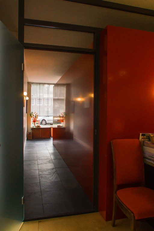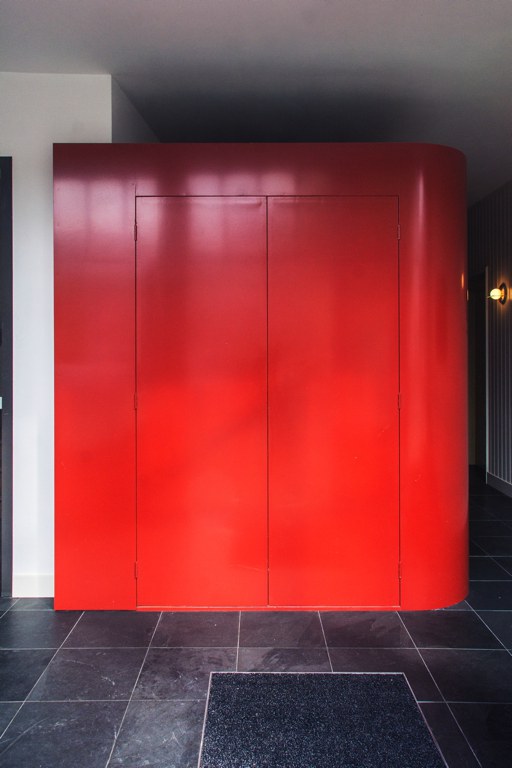 Verbouwing van het atelier op de begane grond naar berging en praktijkruimte. De berging is als los element in de ruimte geplaatst.