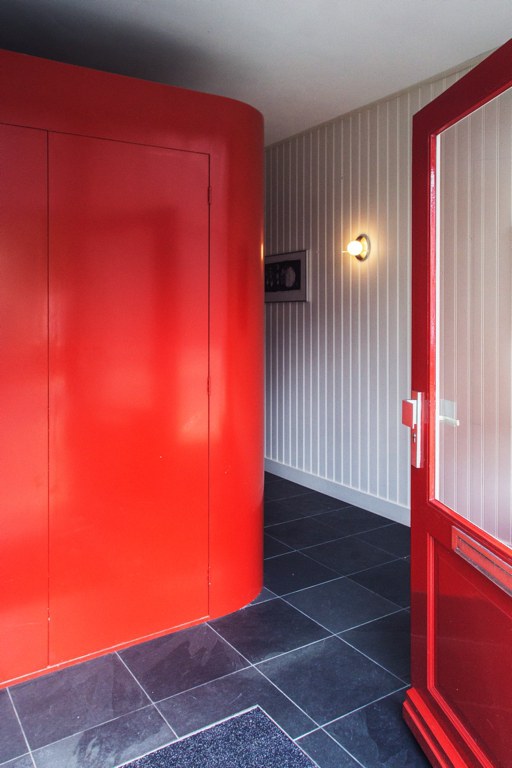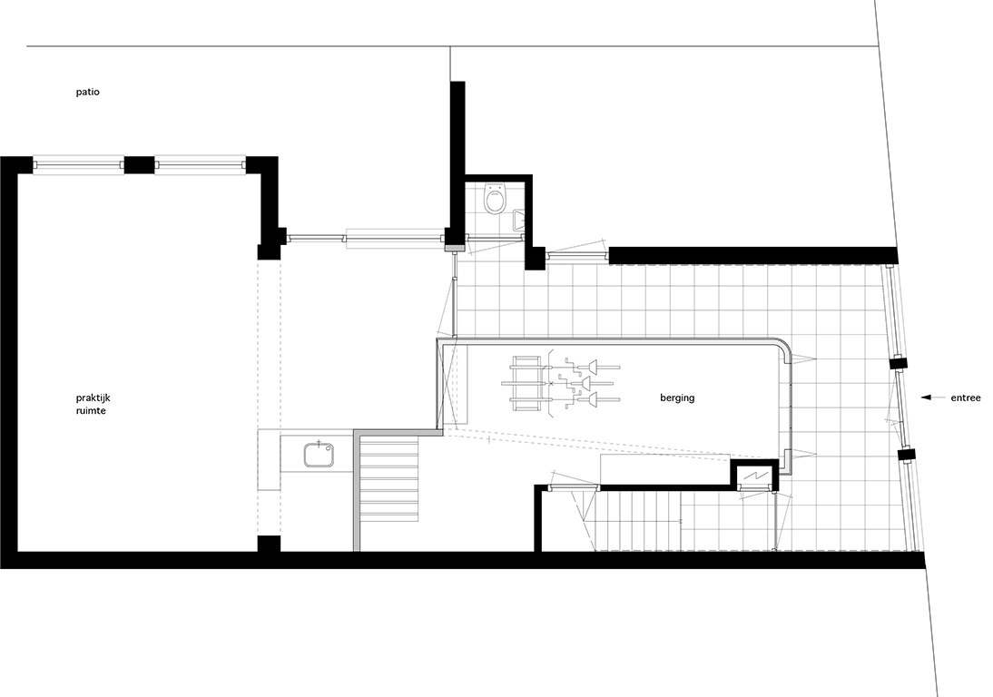 Verbouwing van het atelier op de begane grond naar berging en praktijkruimte. De berging is als los element in de ruimte geplaatst.